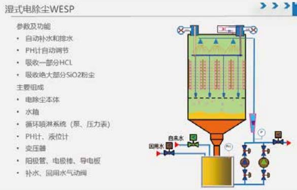 光纖行業等工藝制程產生的大量極細微(亞微米)粉塵或顆粒物 (如SiO2)、氯化氫(HCL)、氟化氫(HF)、氯氣(CL2)或其它 污染物通過濕式高壓靜電除塵進行處理,達到國家排放 標準后排放。濕式高壓靜電除塵器具有去除效率高、運行費用低、耐腐 蝕、多種污染物同時去除等優點,廣泛應用于光纖、半導體、化工、面板等行業。