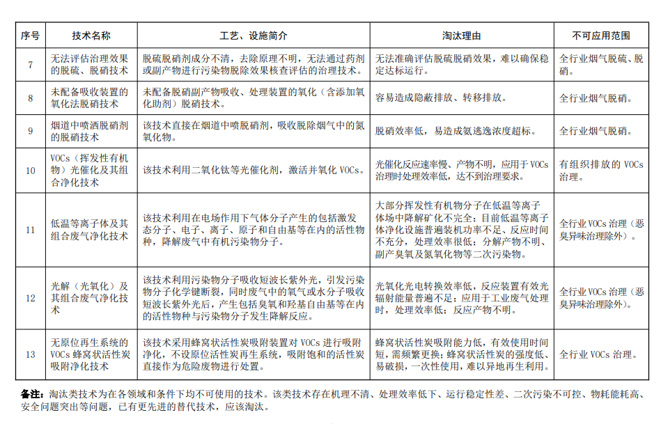 其中限制類7 項,淘汰類13項,涉及除塵、脫硫脫硝、VOCs治理等大氣污染防治細分領域。